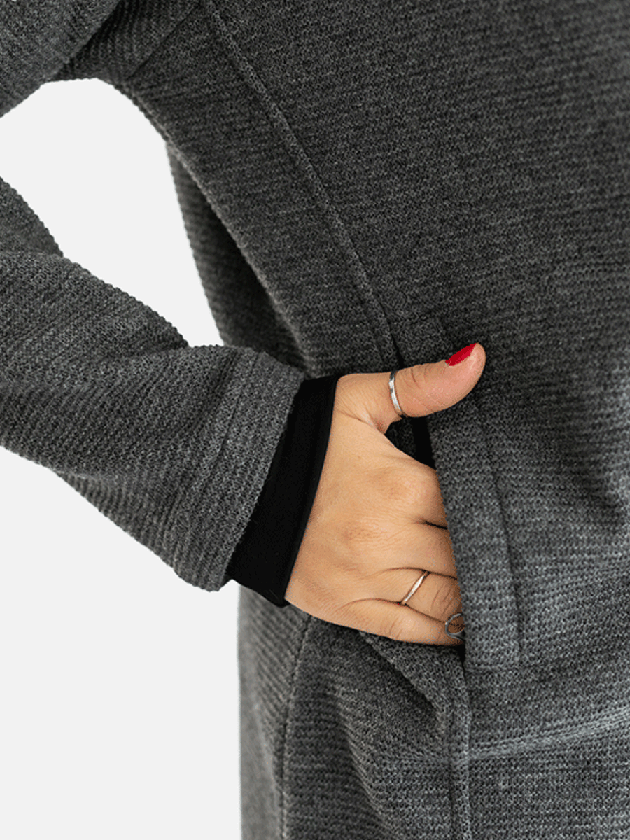 Chiusura con zip sul davanti, tasche laterali richiudibili, cappuccio regolabile e maniche con polsini. È sottile e poco ingombrante e agevola i movimenti ma allo stesso tempo soffice e caldo.