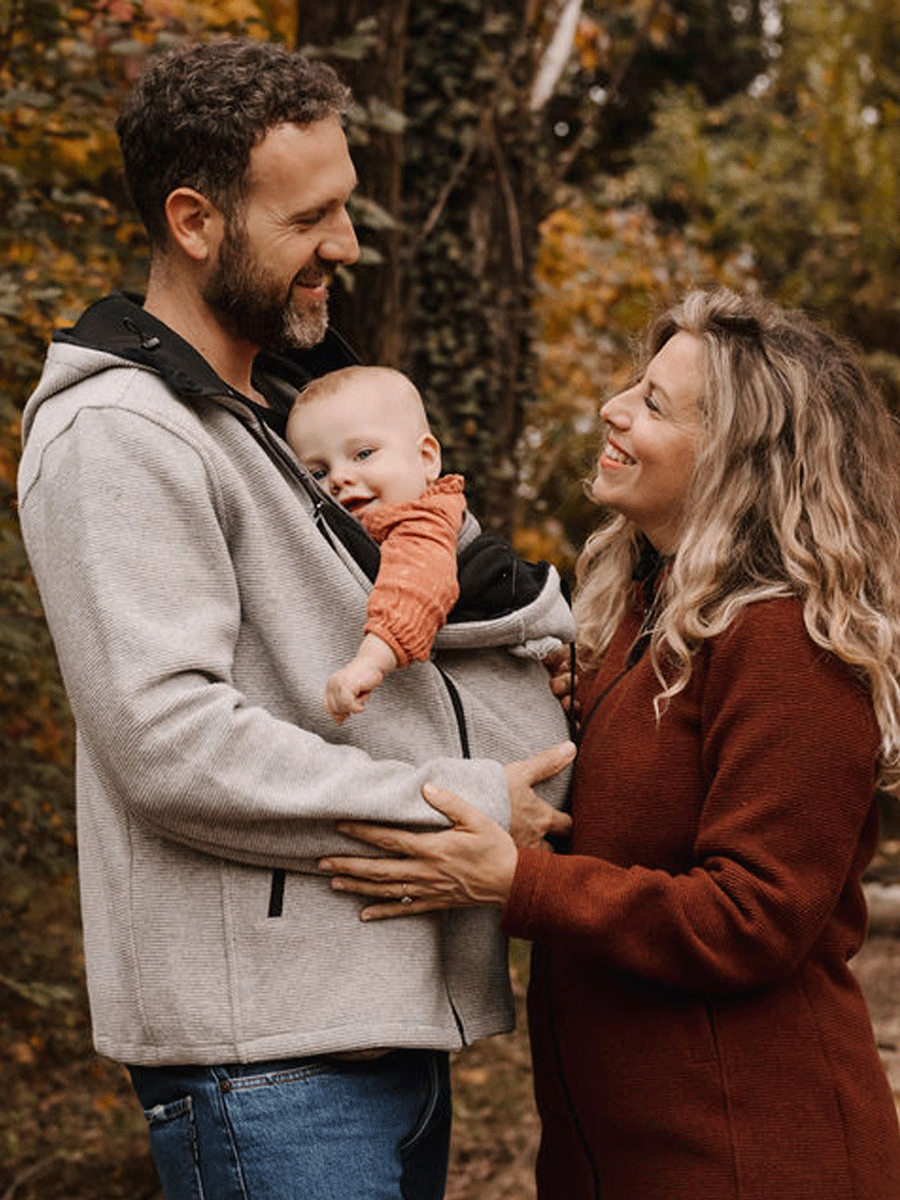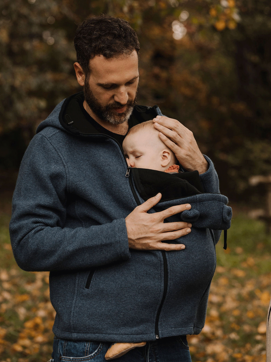 Nasce come capo da uomo da portare tutti i giorni, ma grazie è possibile utilizzarlo per portare il bambino con un supporto (fascia o marsupio) sopra al cappotto.