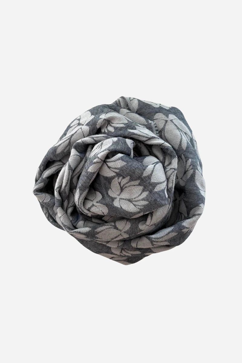 Il motivo del fiore di loto richiama equilibrio e rigenerazione. La sciarpa di lana Jala — dal sanscrito “acqua” — fa parte della collezione Terra & Acqua, ispirata agli elementi della natura, ed evoca l’elemento vitale in cui il loto affonda le sue radici, essenziale, puro, perfetto nella sua semplicità.