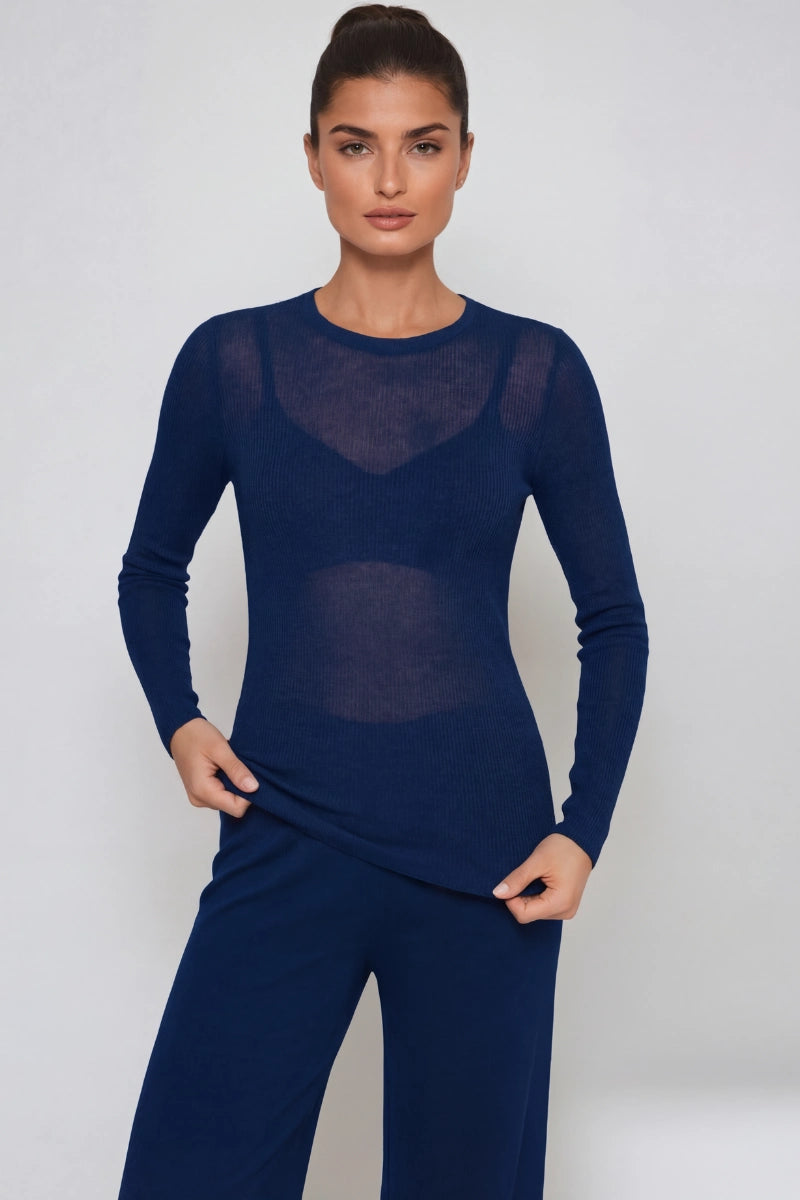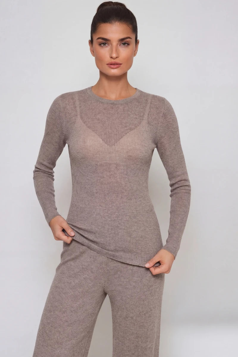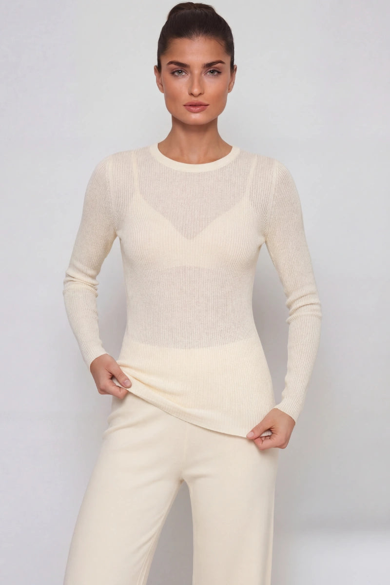 Realizzata in modal e cashmere, con lavorazione a costine con effetto trasparenza, ha un tessuto liscio, morbido sulla pelle e naturalmente traspirante. Non pizzica, si adatta con delicatezza alle forme e offre una vestibilità regular ideale per l’uso quotidiano.