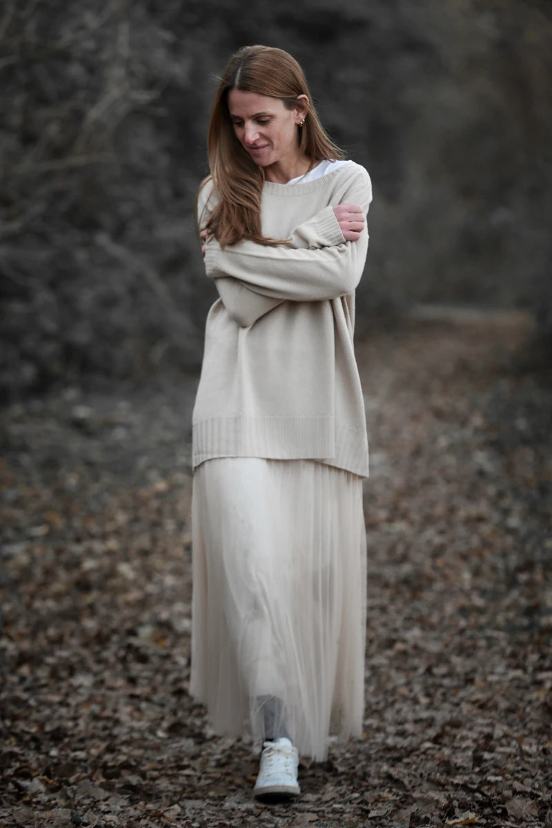 Il maglione girocollo donna lungo dalla vestibilità over è perfetto da indossare tutti i giorni, sia in casa che per l'ufficio.