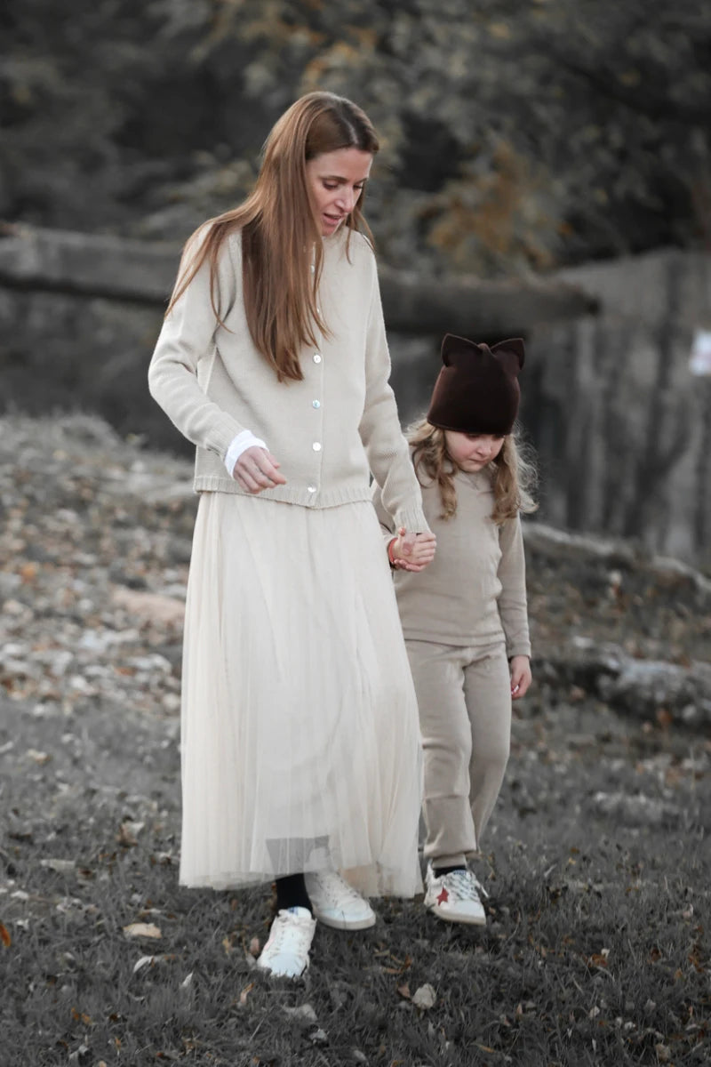 Il design è semplice ed elegante: girocollo classico, manica lunga e bottoncini frontali. La vestibilità comoda abbraccia il corpo senza costrizioni, adattandosi a diverse fisicità con naturalezza.